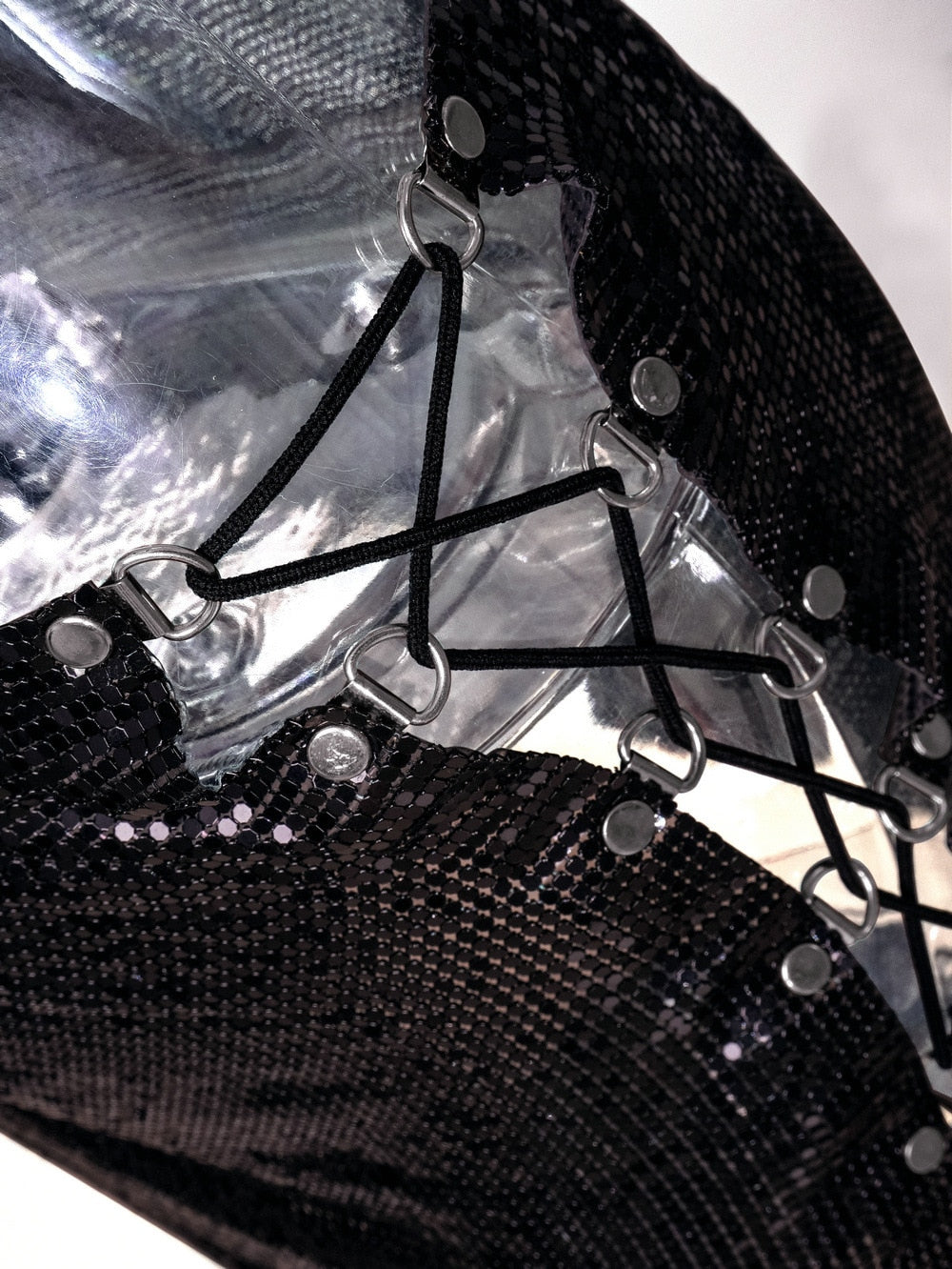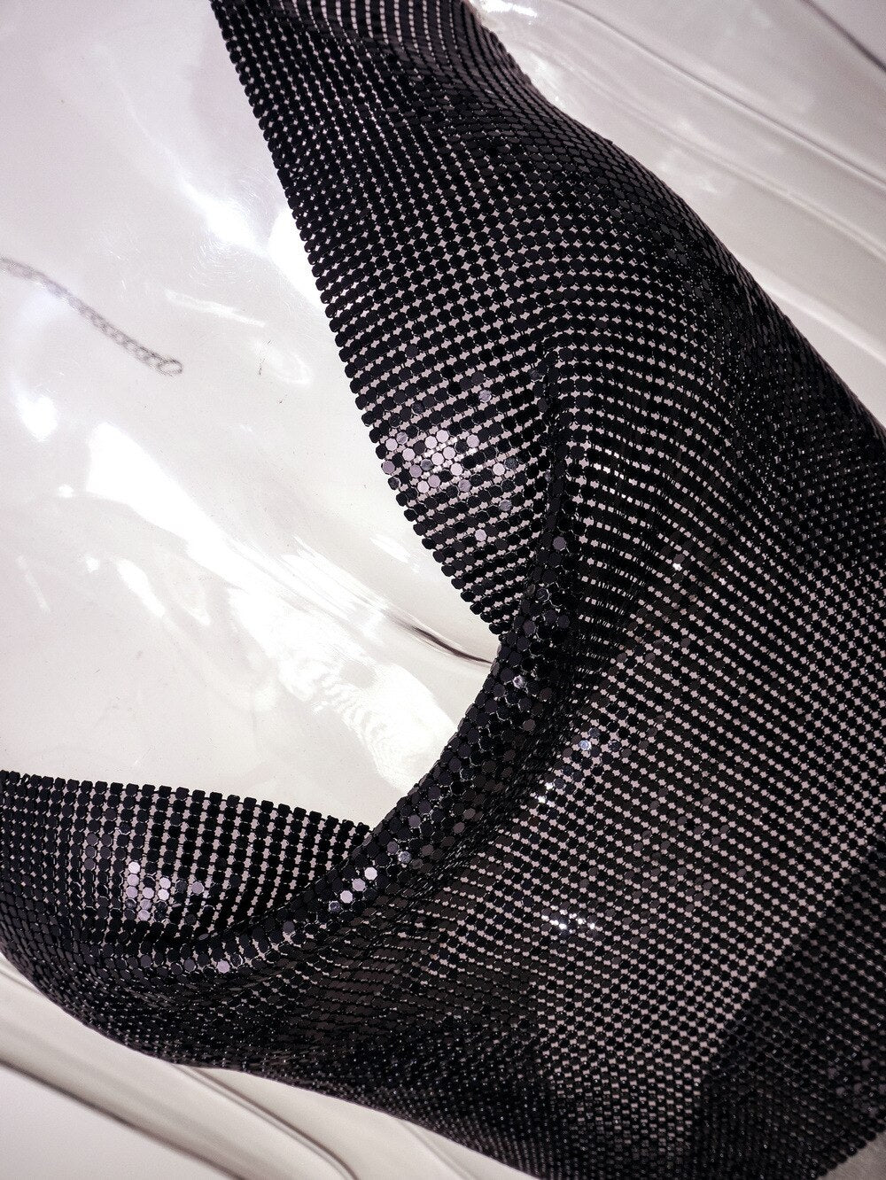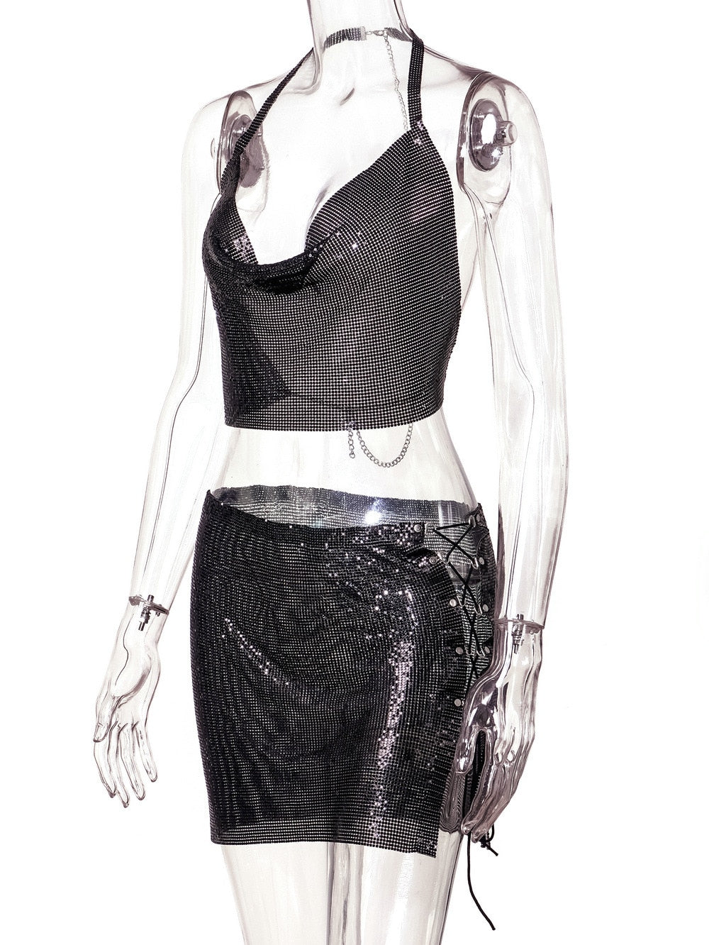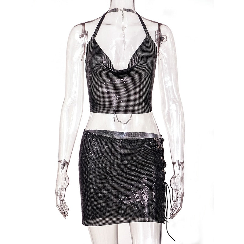 Type: Matching set, two piece, skirt and top, metal, sheer, halter, lace up