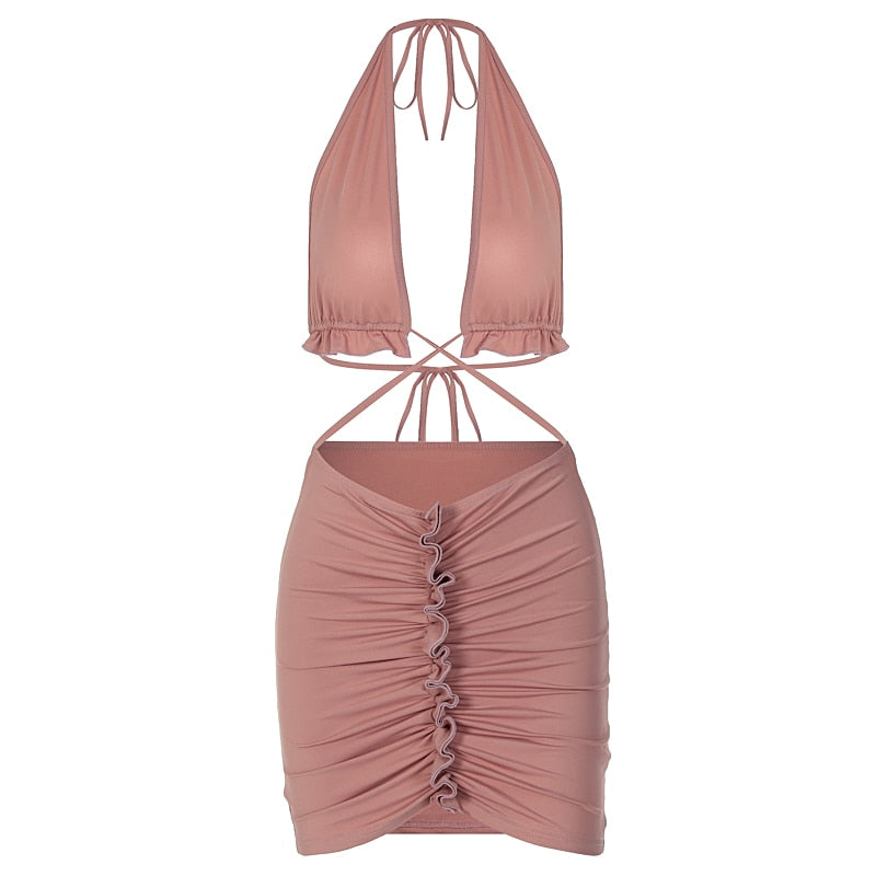 Type: Two piece, matching set, top and skirt, ruched, tie back, wrap around, backless, tight, pencil skirt