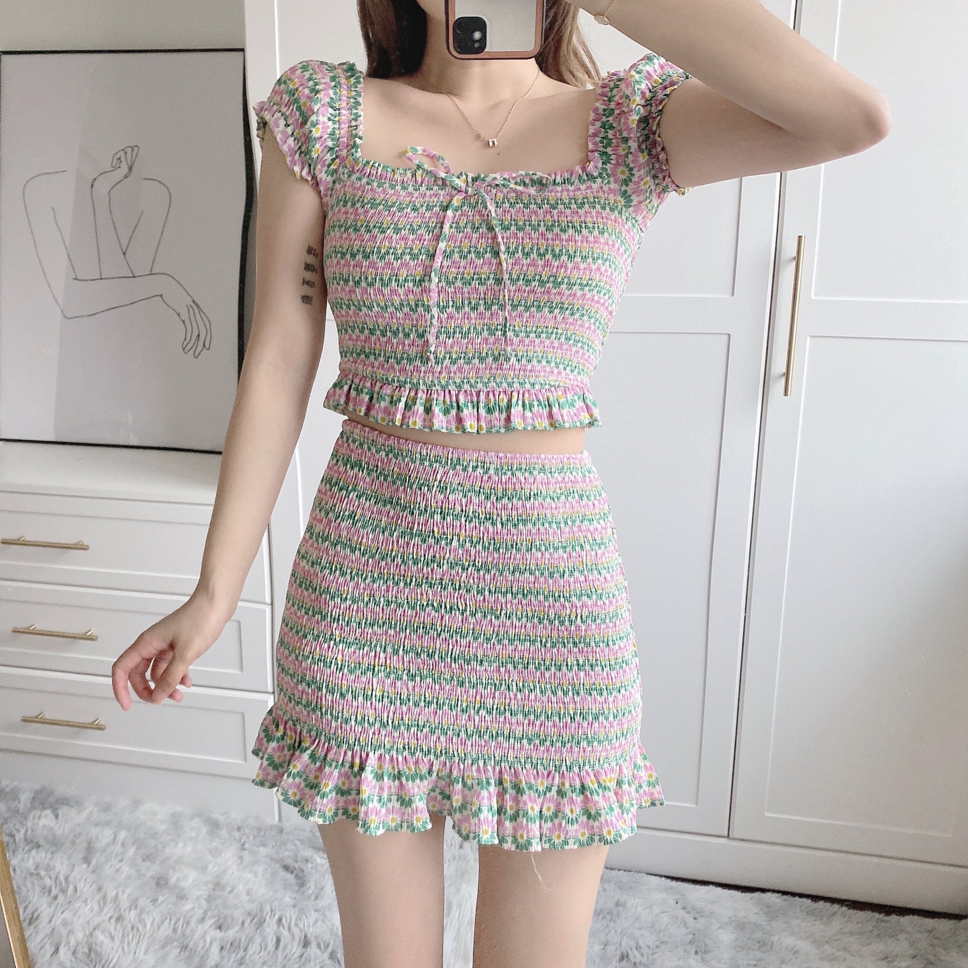 Type: Two piece, skirt and top, matching set, mini skirt and crop top set